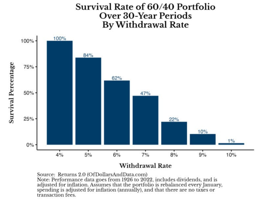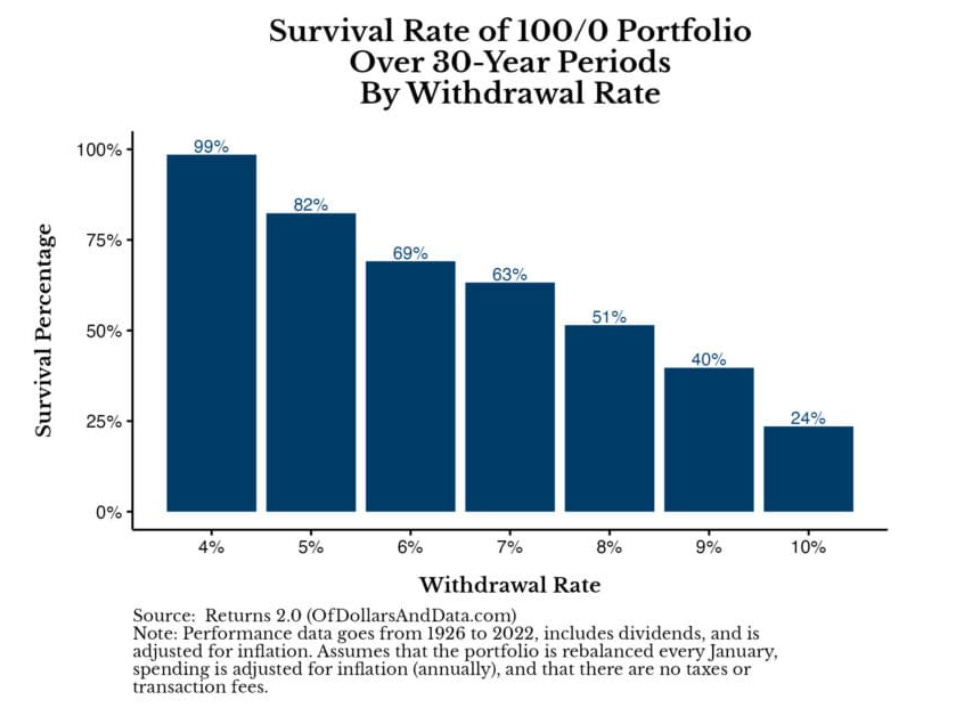 These are great charts from Nick Maggiulli highlighting the survival rate of portfolios over 30-year periods by withdrawal rates using historical returns from 1926 - 2022: